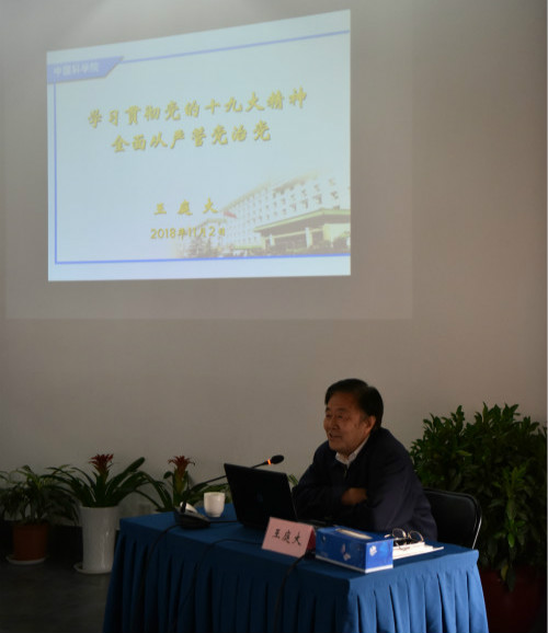 中央紀委駐院紀檢組原組長王庭大書記做了《學習貫徹黨的十九大精神,全面從嚴管黨治黨》的輔導報告。王書記結合中央黨的十九大精神,從關于馬克思主義的黨、全面從嚴治黨、新時代黨建的要求三方面闡述了全面從嚴治黨的理論和實踐。